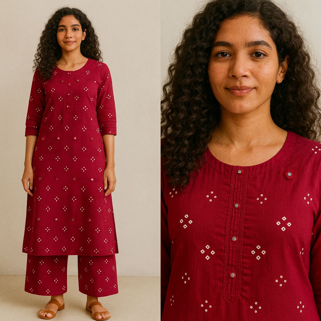 Thoughtfully crafted with functional pockets for added convenience, the kurta is further enhanced with beautiful real mirror detailing around the neckline, adding a subtle touch of traditional charm and elegance. Perfect for casual outings, festive occasions, or graceful daywear, this ensemble blends comfort with timeless sophistication.