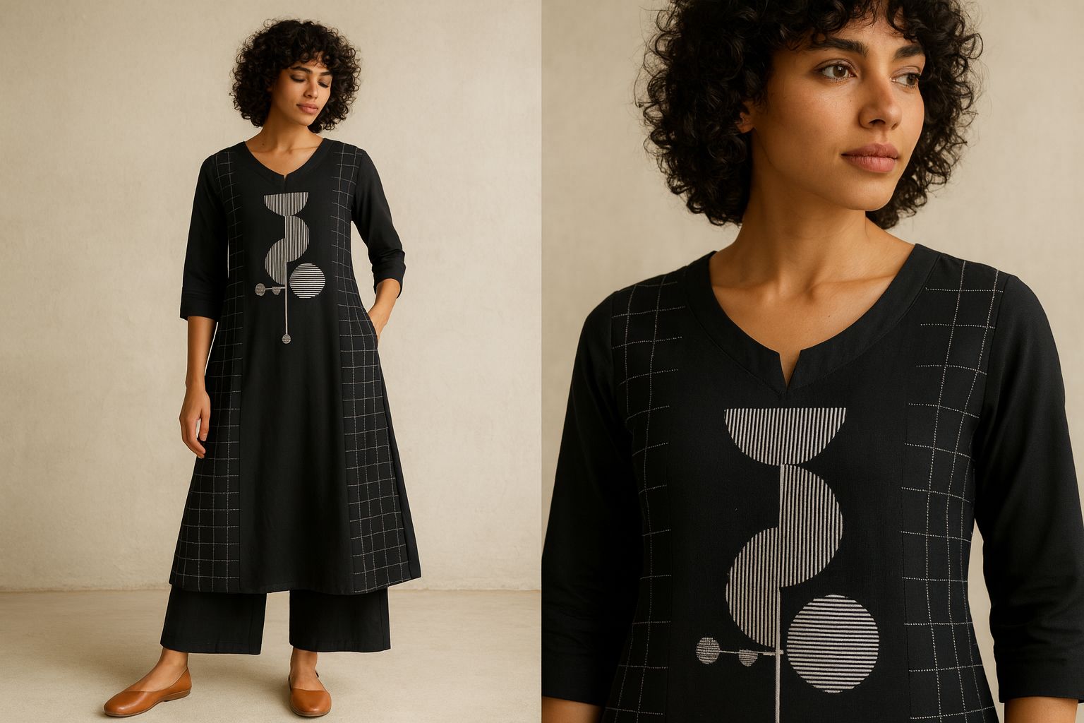 Made from pure cotton fabric, this graceful A-line kurta set is designed for breathable comfort and effortless everyday style. The kurta is paired with matching loose-fit pants, offering a relaxed yet flattering silhouette suitable for all-day wear.